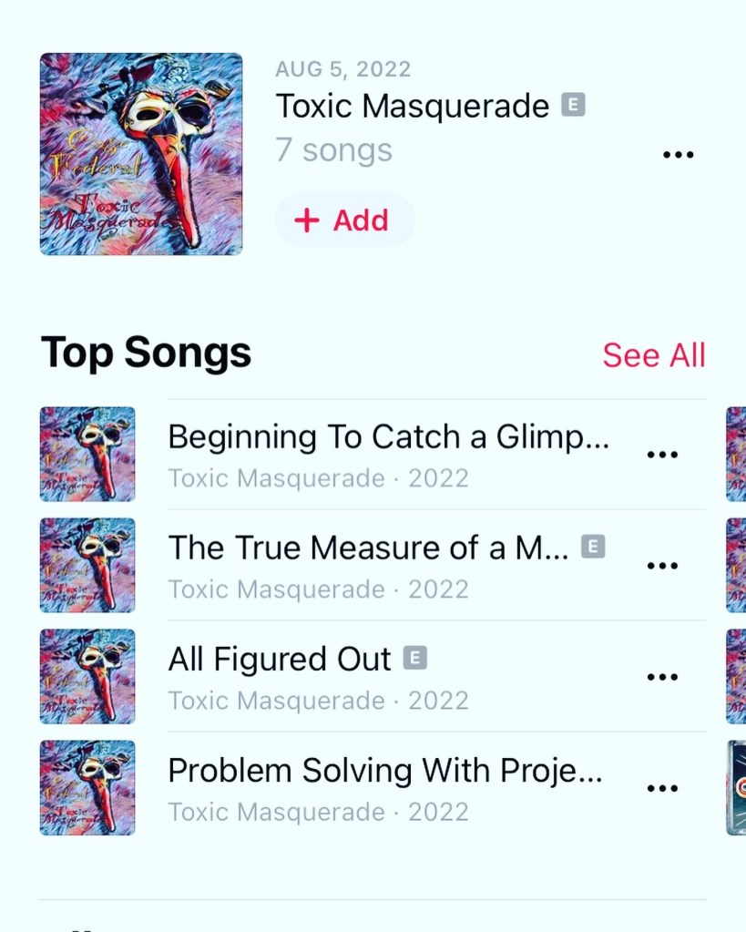 This album is called “Toxic Masquerade” and features 7 tracks about societal expectations, toxic masculinity, developing your own philosophies and identity, facing past trauma, embracing friendship in community, and overall staying true to yourself…